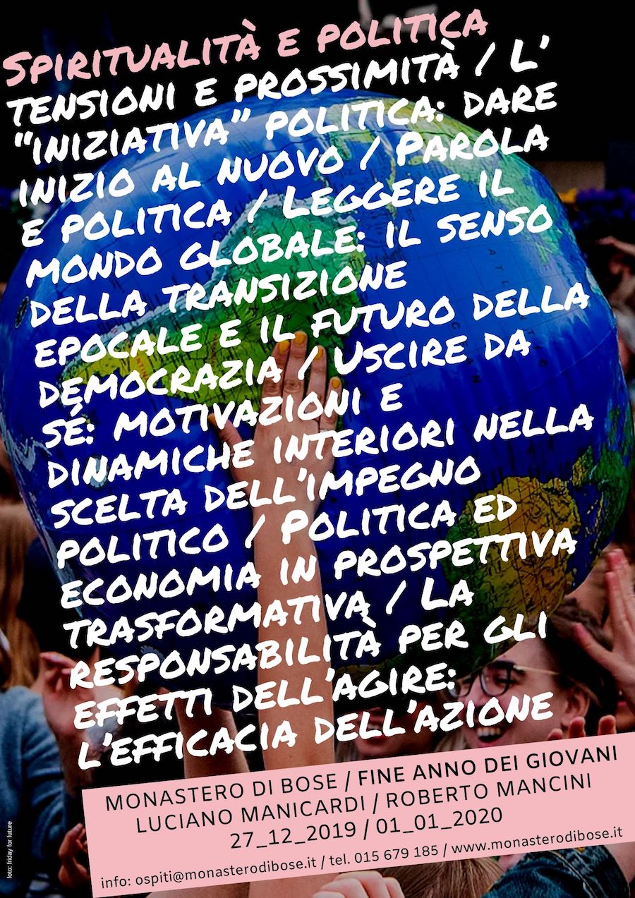 Dal 27 dicembre al 1° gennaio un centinaio di giovani sono stati ospiti presso il monastero di Bose per vivere insieme i giorni di festa che chiudono l'anno vecchio e aprono il nuovo. Giorni densi, segnati da incontri su temi di spiritualità e politica e scanditi da momenti di tempo libero, da scambi e condivisione. Luciano Manicardi, priore della comunità, e Roberto Mancini, professore di filosofia all'Università di Macerata, hanno dialogato con i giovani e le giovani presenti sull'importanza cruciale di coltivare e custodire una propria vita interiore, sulla qualità della quale si gioca l'impegno in ambito pubblico.